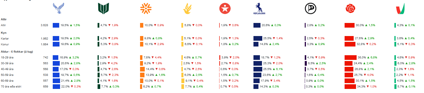 Í könnun Maskínu sem birt var í byrjun viku er þessi munur enn skarpari. Þar segjast 29,4 prósent svarenda í þessum aldurshópi styðja Samfylkinguna og er fylgið því umfram heildarfylgi líkt og hjá Gallup. Miðflokkurinn mælist hins vegar með 11,2 prósent, eða rétt tæplega einn þriðja af því fylgi sem Samfylkingin hefur hjá kjósendum á aldrinum 18-29 ára.