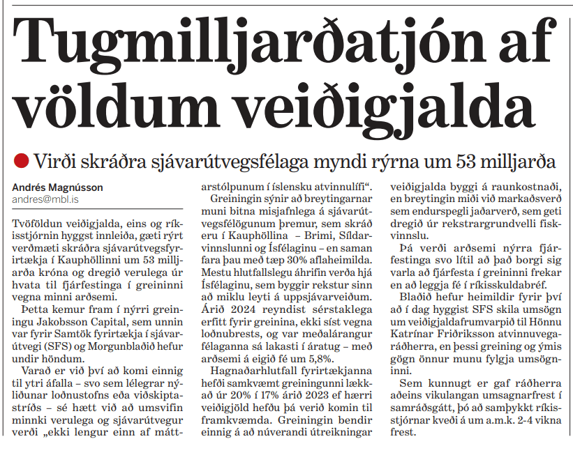 Forsíðufrétt Morgunblaðsins hafði verið sögð daginn áður en hún var birt, á Innherja Vísis, daginn áður. Framkvæmdastjóri SFS settist í stjórn Sýnar, eiganda Vísis, í síðasta mánuði. Mynd: Skjáskot