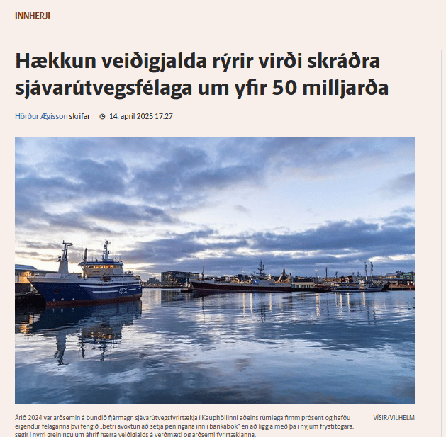Svo er það þannig að þegar atvinnustarfsemi byggist á því að nýta takmarkaða auðlind í þjóðareigu, þá hafa ákvarðanir eigenda hennar eðlilega áhrif á virði þess sem fær að nýta hana. Það má til að mynda færa rök fyrir því að sú ákvörðun síðustu ríkisstjórnar Vinstri grænna, Sjálfstæðisflokks og Framsóknar að breyta veiðigjaldainnheimtu þannig að gjaldið hefur dregist verulega saman ef það er sett á verðlag dagsins í dag hafi aukið markaðsvirði umræddra fyrirtækja á kostnað þeirrar rentu sem eigendur auðlindarinnar gátu innheimt.