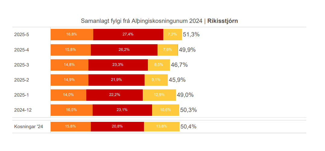 Maskína gerði fleiri kannanir á síðustu vikum. Meðal annars á fylgi flokka, sem sýnir svart á hvítu að stuðningur við ríkisstjórnina er að aukast. Flokkarnir sem að henni standa hafa ekki mælst með meira sameiginlegt fylgi það sem af er kjörtímabili og eru nú með meira fylgi en þegar talið var upp úr kössunum í lok nóvember. Þetta bætist við könnun Gallup frá því í byrjun mánaðar sem sýndi stöðugan stuðning tveggja af hverjum þremur kjósendum í landinu við ríkisstjórn Kristrúnar Frostadóttur.