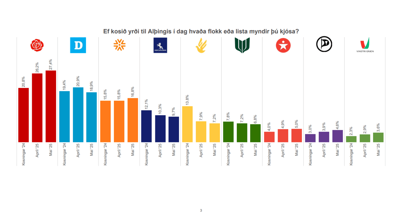 Könnun Maskínu sýndi bæði Sjálfstæðisflokkinn og Framsókn undir kjörfylgi, sem þýðir að framganga þeirra í stjórnarandstöðu er ekki að skila flokkunum miklum vinsældum. Það sama gildir reyndar um Miðflokkinn. Hann er líka að mælast vel undir því sem flokkurinn fékk í síðustu kosningum.